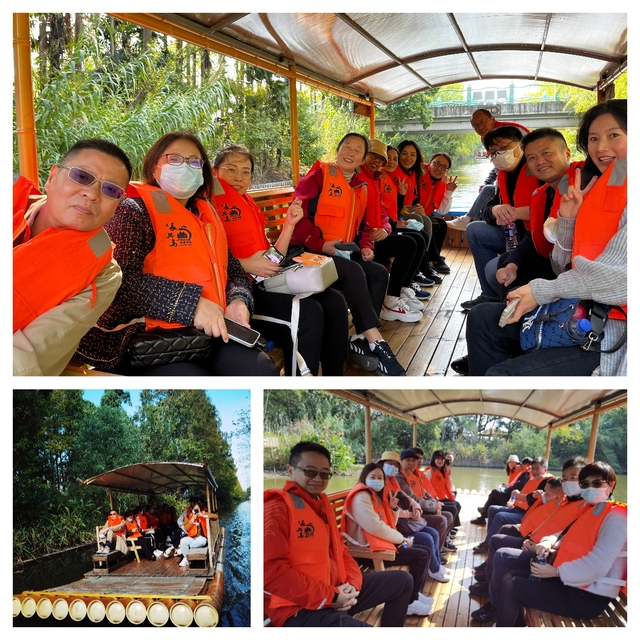 11月5日上午,老师们来到上海面积最大的郊野公园——长兴岛郊野公园。长兴岛郊野公园是曾以“农垦战线排头兵”“柑橘种植状元郎”享誉全国的国营前卫农场转型而建立的。秋高气爽,柑橘飘香,郊野公园内秋游人群如潮。老师们乘着竹筏漂流于郊野公园的小河之上,微风拂面,水波荡漾,两岸树木茂盛,不时会有垂下的枝条抚摸脸颊,偶尔还能看到鱼儿跃出水面,有一条调皮的小鱼竟然跃至船板上,老师们欢笑中将其捡起又放入水中……欢笑声、歌声荡漾在河面上,与大自然的亲密接触令人心旷神怡,老师们尽情享受轻松、欢乐的时光,真是悠哉乐哉!