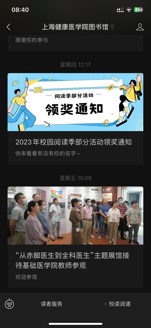 进入“上海健康医学院图书馆“微信公众号-“读者服务”-“我的借阅”