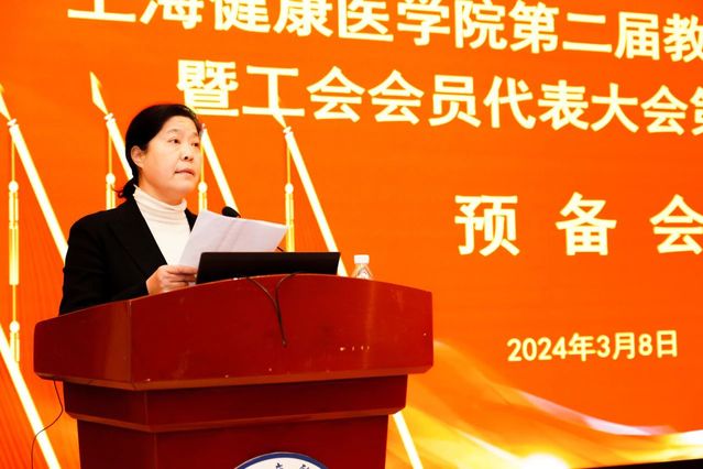 3月8日上午八点,上海健康医学院第二届教代会暨工代会第六次会议开幕会在北苑1号楼200人报告厅隆重举行。党委书记郭永瑾、党委副书记、校长吴韬、党委副书记、副校长唐红梅、党委副书记于莹、党委副书记、纪委书记高红、副校长马耀良、副校长汤磊出席会议,全体代表、学校中层干部、离退休老同志代表、学院及教学部学科带头人、附属医院及直属社区卫生服务中心党政工领导代表200人出席会议。党委副书记、工会主席于莹主持大会。