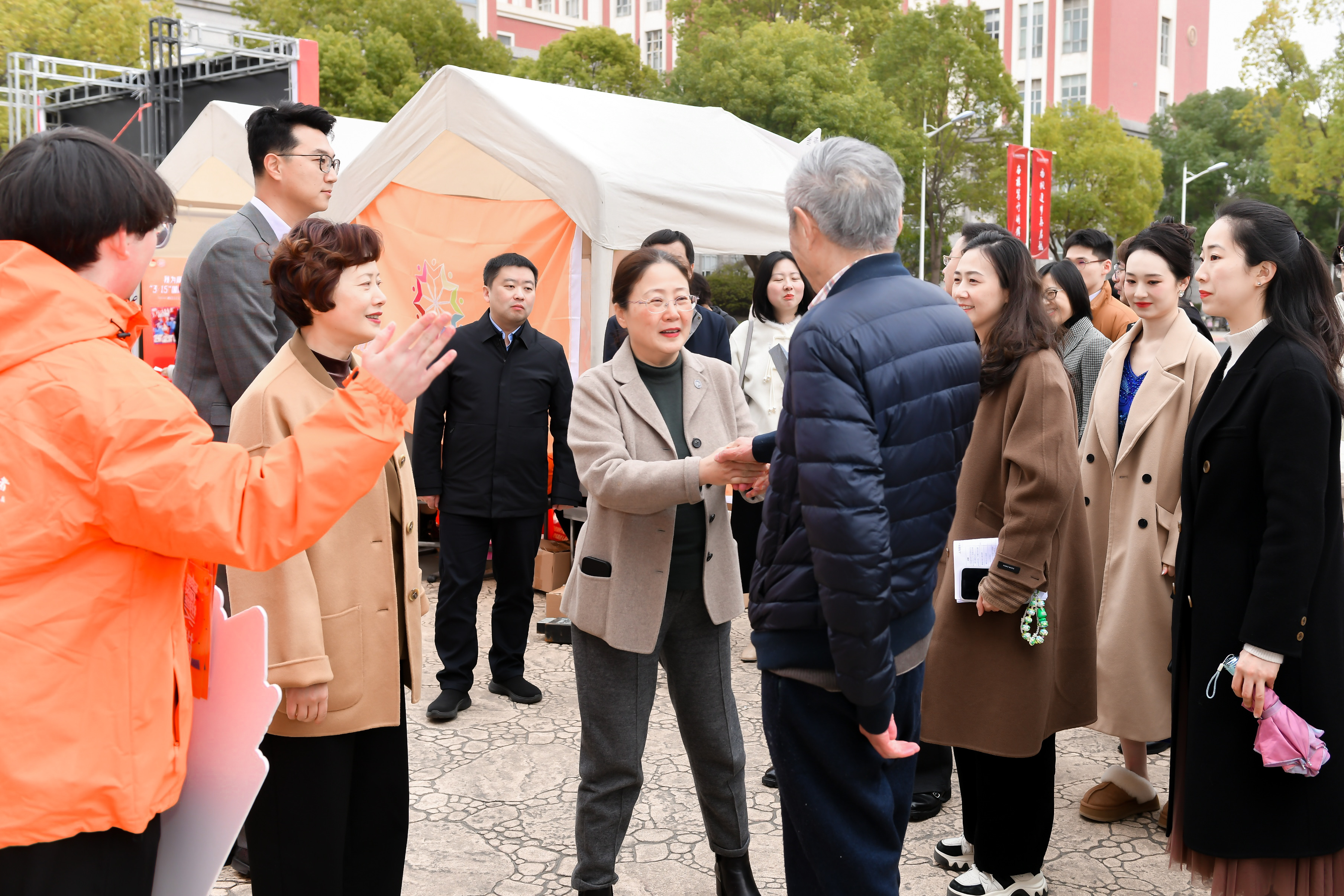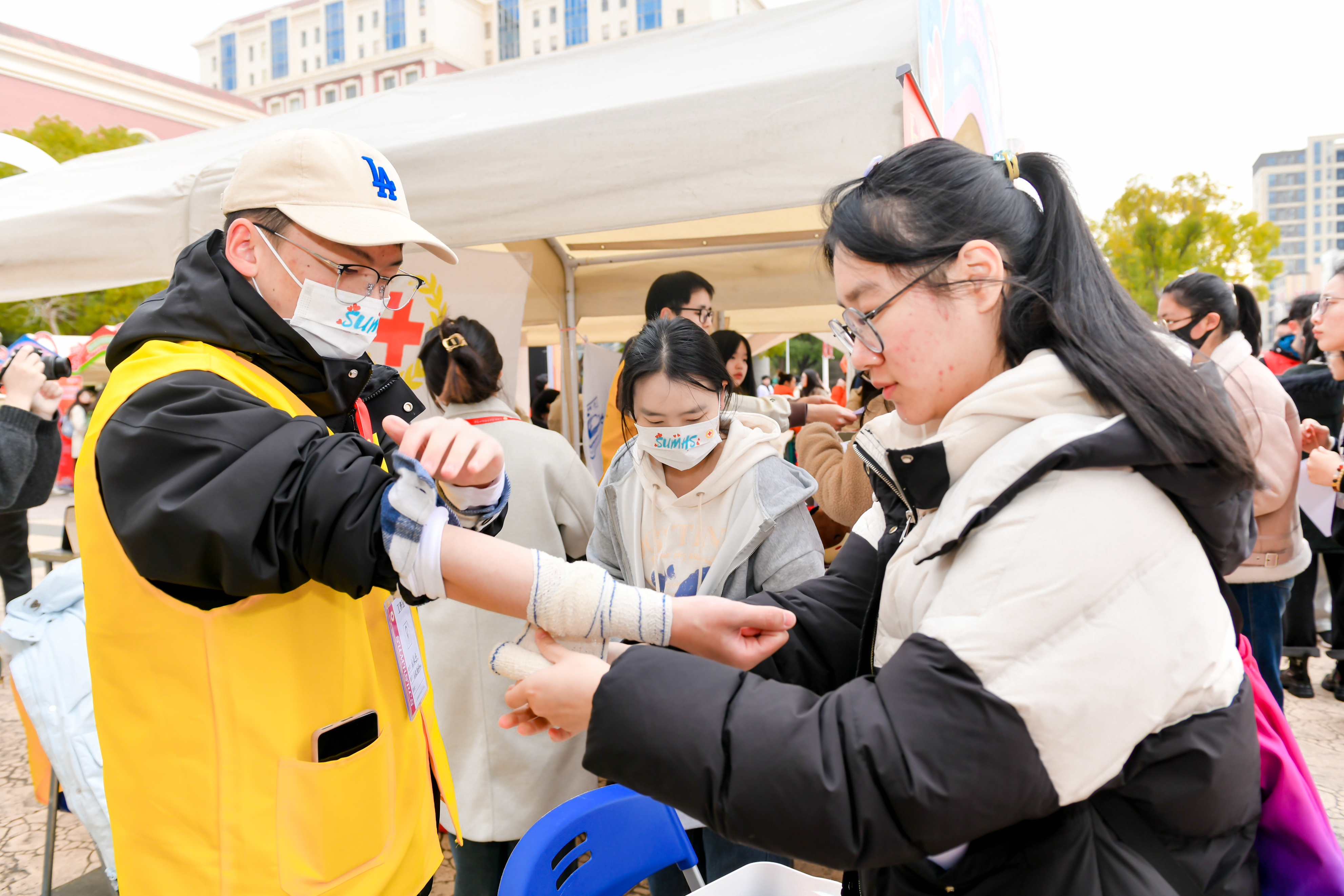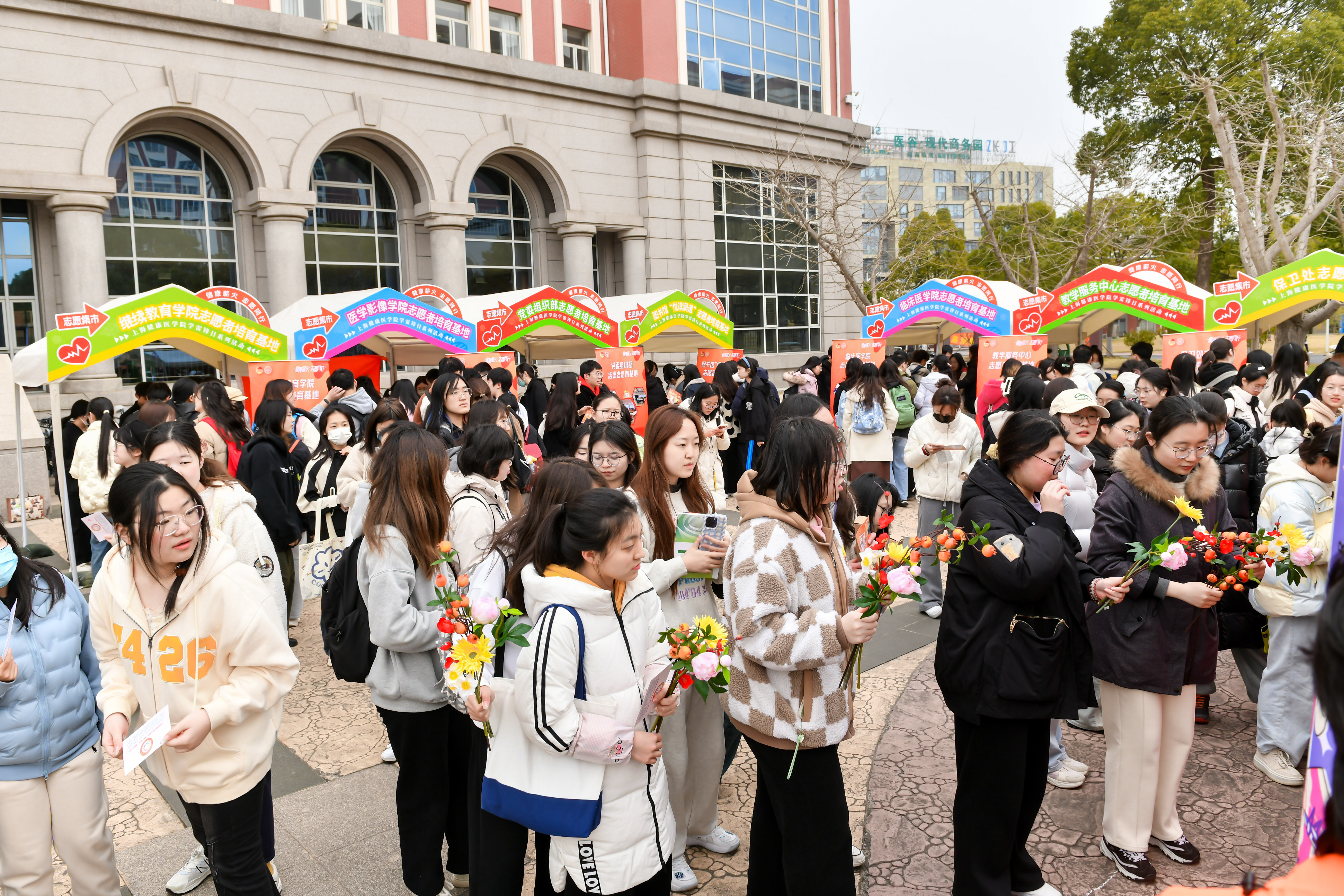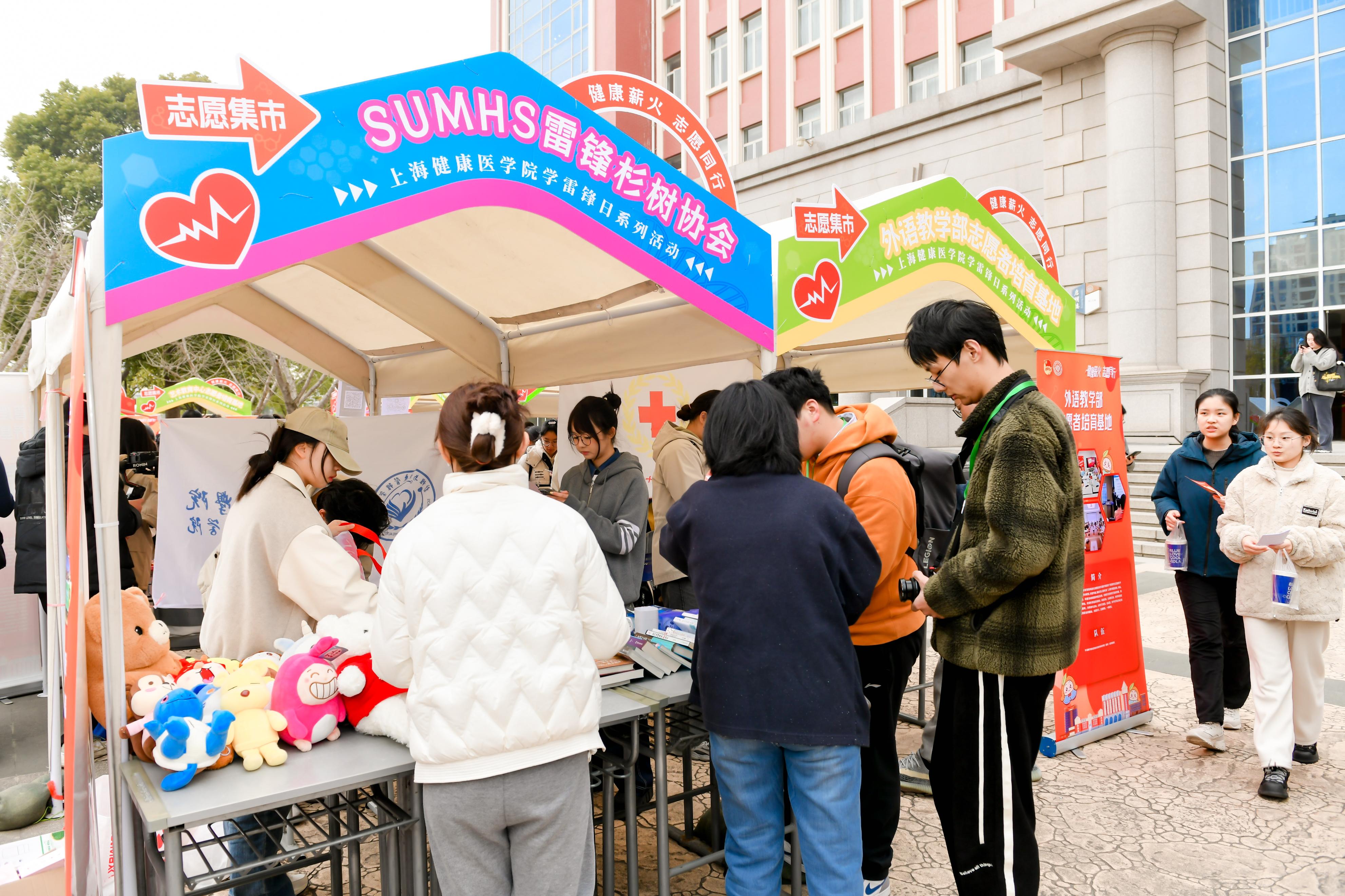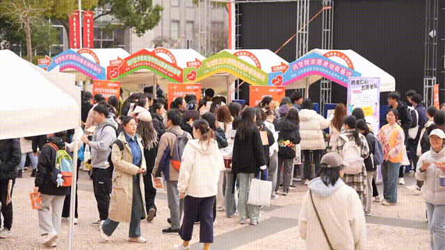 中午12点,学雷锋日系列活动之“志愿集市”在北苑2号楼前热闹“开市”。学校23个志愿者培育基地、198个志愿服务团队、SUMHS雷锋杉树协会以及后勤服务中心志愿服务队,充分展示了团队功能、特色活动和所获荣誉等,涵盖思想教育、健康科普、急救培训和日常生活等领域。各志愿者培育基地根据各自专业特色,提供了丰富多彩的趣味打卡活动,吸引了众多师生前来参与体验,构成健康园里一道亮丽的风景线。校党委书记郭永瑾,校长吴韬,校党委副书记、副校长唐红梅等领导嘉宾一行参观体验志愿集市,并对我校志愿服务工作给予高度评价。