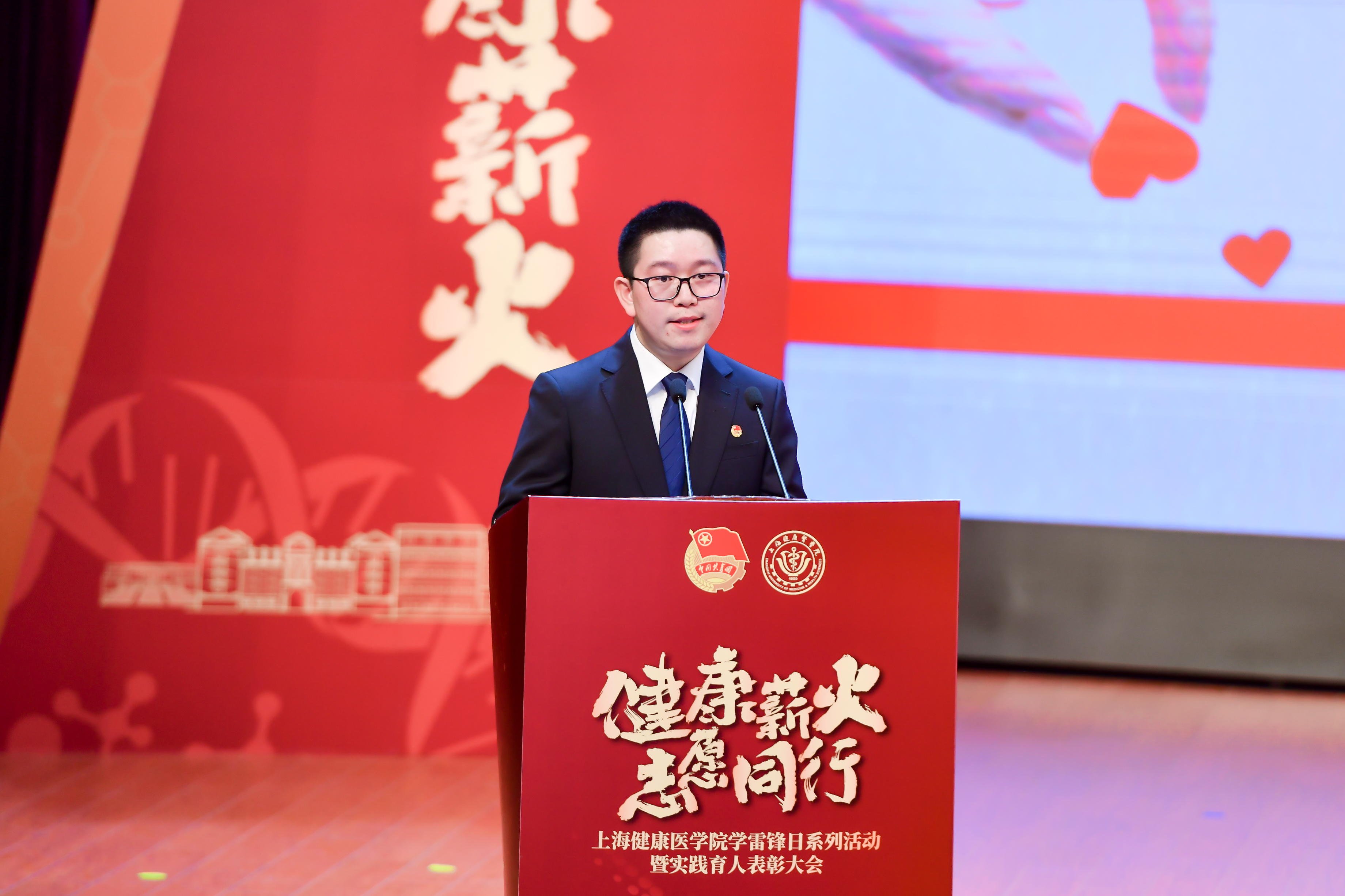 下午2点,“健康薪火 志愿同行”上海健康医学院学雷锋日系列活动暨实践育人表彰大会于北苑1号楼400人报告厅隆重举行。原中国健康教育协会副会长、世界卫生组织上海健康教育与健康促进合作中心主任胡锦华,共青团上海市委员会学校工作部部长任浡,共青团上海市黄浦区委员会社会工作部副部长蒋益 ,贵州省社会办医疗机构协会秘书长樊敏,上海市健康促进中心副主任陈德,上海浦东新区社会发展基金会秘书长王玉,华东医院团委副书记、健康促进委员会办公室主任秘书周靓贇,上海市长宁区妇幼保健院副院长劳国颖,上海健康医学院青年志愿者指导教师、全国最美志愿者傅向东,以及上海健康医学院党委书记郭永瑾,党委副书记、副校长唐红梅,学工部部长童清、后勤服务中心主任张美蓉、学工部副部长于杨、学工部副部长罗瑾琰、校友工作办公室副主任王红,各学院党总支副书记、团总支书记,校内各培育基地负责人和50余家校外志愿者实践基地指导老师出席本次大会。