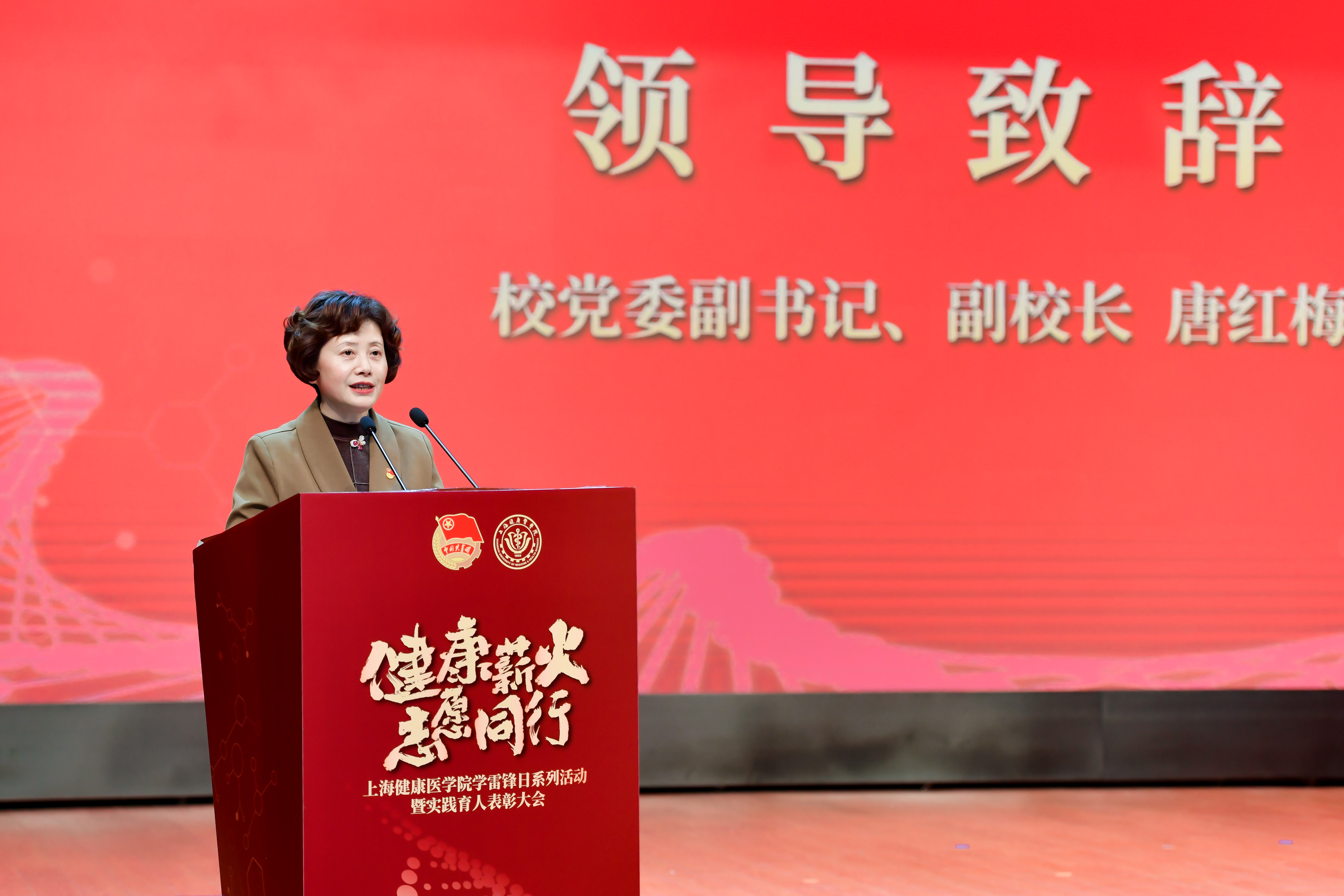 大会伊始,唐红梅致欢迎辞。她表示,近年来,学校涌现出一批又一批雷锋式先进集体和模范人物,健康青年把美好青春投入到了“健康中国”和“健康上海”的火热实践中,为新时代伟大变革注入不竭精神动力。她指出,健康青年要不断深入学习宣传贯彻党的二十大精神,贯彻落实习近平总书记对深入开展学雷锋活动作出的重要指示精神,深入推进我校青年志愿服务活动制度化、常态化、品牌化建设。她希望同学们要秉承“厚德至善,健行康民”的校训精神,做勇挑重担的“接班人”、做乘风破浪的“追梦人”、做行胜于言的“实干家”,服务“国之大者”,力行“民之关切”,以永不懈怠的精神状态和一往无前的奋斗姿态,在实现中华民族伟大复兴中国梦的新长征路上乘风而歌、踏浪前行。