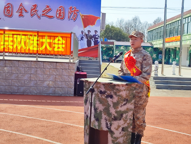 2021级口腔医学技术(本科)班张佳俊同学代表新兵发言,他表示,作为一名新兵战士,要传承红色思想,涂亮忠诚底色;苦练杀敌本领,筑牢钢铁长城;团结革命同志,共度迷彩青春。