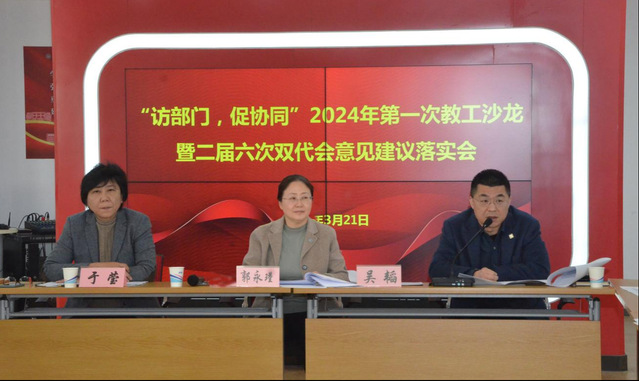 2024年3月21日,“访部门、促协同”2024年第一次教工沙龙暨二届六次双代会意见建议落实会在北苑1号楼500室举办。党委书记郭永瑾,校长吴韬,党委副书记、工会主席于莹,相关职能部门负责人,提案工作小组委员和教师代表三十余人参加会议,会议由工会常务副主席凌文惠主持。