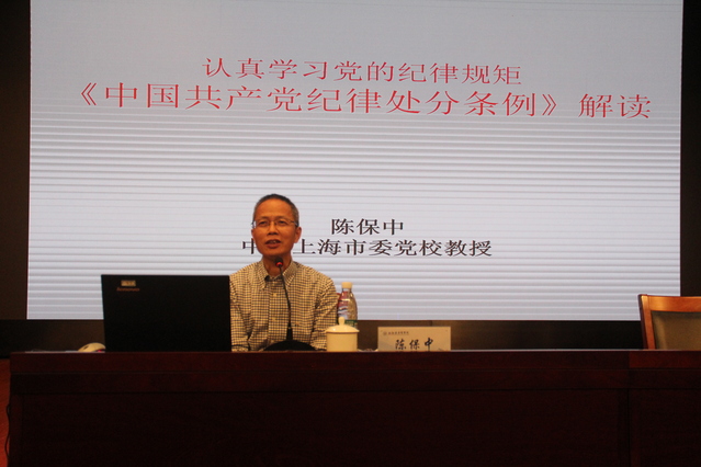 开班式结束后,党委理论学习中心组(扩大)学习会、党纪学习教育读书班举行专题报告,上海市委党校政府治理研究院副院长陈保中教授作了《中国共产党纪律处分条例》解读辅导报告。他从《条例》修订的时代背景和重要意义、习近平总书记在中纪委全会重要讲话精神、《条例》的体系和主旨要义、全面从严治党永远在路上等方面进行了全面解读,陈教授授课内容丰富,语言生动、案例详实,使各位学员对《条例》有了更深刻的认识和理解。