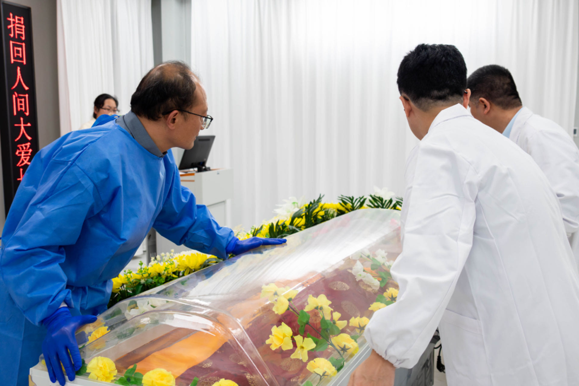 2024年4月23日,上海市红十字上海健康医学院遗体捐献接受站迎来一位特殊的“大体老师”刘女士(应家属保密要求,在此不具实名)。她是一位罕见的“镜面人”,她以捐献角膜和遗体的实际行动诠释“大爱无疆”的精神。接受站站长、基础医学院本科教学团队负责人李志宏老师、解剖组胚教研室主任吕叶辉老师、实验中心主任李堃老师、自发前来的学生代表和捐献者家属一起为她举行了庄严肃穆的告别仪式。