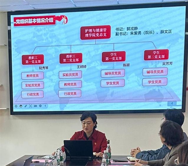 会上,郭戎静对护管学院党纪学习教育的开展情况作了汇报。她强调学院党总支高度重视,严格对标对表,把开展党纪学习教育作为巩固拓展主题教育的有力举措,将党纪学习教育融入日常工作中,通过领导班子带头领学、党支部集体跟进学、结合实际多样学等“三学联动”的举措,推动《中国共产党纪律处分条例》学习全覆盖,同时介绍了学院的党建特色与亮点。院长朱爱勇介绍了学院坚持党建与中心工作深度融合的工作理念和具体举措,凝心聚力推动学院事业高质量发展。