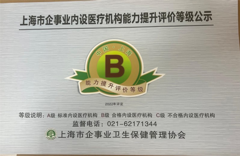 近日,我校卫生所在上海市企事业内设医疗机构能力提升评价中荣获B级证书,这是我校内设医疗机构在医疗服务和能力方面取得的一项成果。