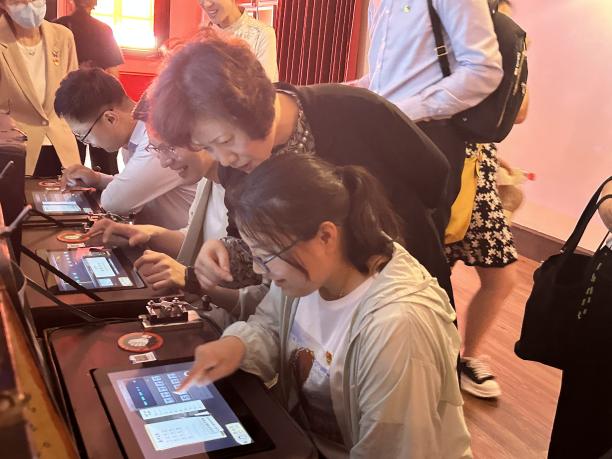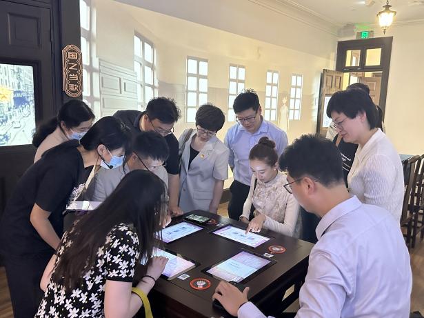 “复兴·颂”作为全国首个以数字互动体验为特色的复合式红色文化体验空间,运用“科技+游戏+互联网”的创新宣传展示方法,选取在中国共产党创建、大革命、土地革命战争、全民抗战、解放战争五个历史时期发生在黄浦的红色故事,打造“希望之门”“真理之路”“革命洪流”“利剑出鞘”“国之当歌”“迎接胜利”等主题。在讲解员的带领下,师生们沉浸式体验了VR实景互动、唱国歌、发电报等板块,通过先进的数字科技、有趣的互动体验,以年轻人喜闻乐见的方式讲述党史,这种强烈的代入感让师生们更进一步了解红色文化、体验红色文化。