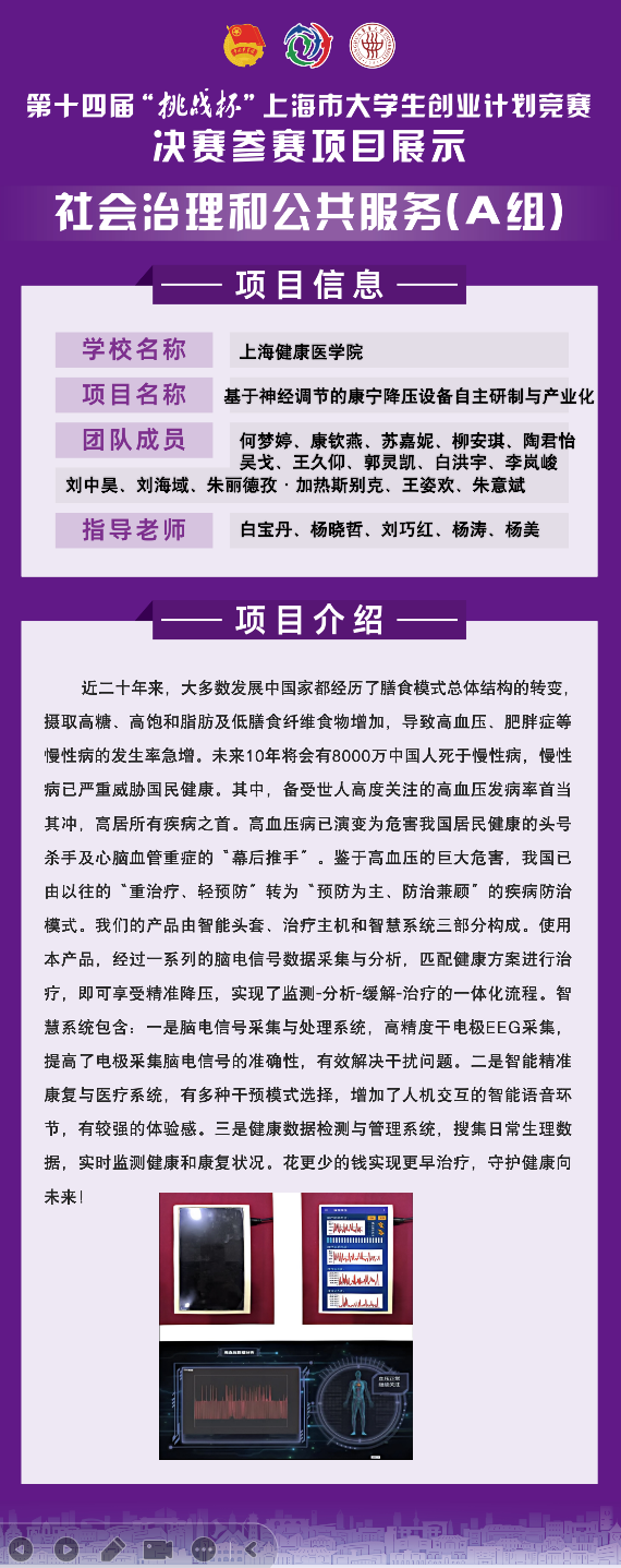 高血压病作为危害我国居民健康的头号杀手及心脑血管重症的“幕后推手”,项目产品由智能头套、治疗主机和智慧系统三部分构成。经过一系列的脑电信号数据采集与分析,匹配健康方案进行治疗,即可享受精准降压,实现了监测-分析-缓解-治疗的一体化流程。智慧系统包含:一是脑电信号采集与处理系统,高精度干电极EEG采集,提高了电极采集脑电信号的准确性。二是智能精准康复与医疗系统,有多种干预模式选择,增加了人机交互的智能语音环节。三是健康数据检测与管理系统,搜集日常生理数据,实时监测健康和康复状况。