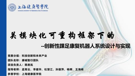 踝关节作为人体负荷的主要承受部位对于行走和负重功能至关重要。近年来,随着老龄人口的增多,脑血管意外的发病率也在不断增长。而这类疾病发生后,患者手部和脚部的功能常常受到影响。因此,该项目设计了一款基于模块化可重构框架的智能踝足康复机器人。该产品在踝关节康复领域具有广泛应用价值,对实质性助力踝关节功能障碍患者具有重要意义,为康复器械行业注入新的活力与机遇,为社会经济发展做出贡献。