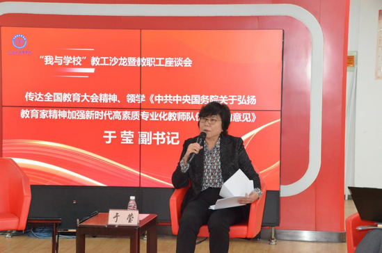 乘着全国教育大会召开的东风,在第40个教师节和新中国成立75周年之际,10月9日上午,教师工作部、校工会在北苑1号楼500教工之家举办了一场温馨而富有意义的“我与学校”教工沙龙暨教职工座谈会。校党委书记郭永瑾,校党委副书记、工会主席于莹,组织部、人事处、教师工作部、工会、相关学院负责人和16名新进教师代表、先进教师代表齐聚一堂,共话发展。本场座谈会由第六届上海高校青教赛二等奖获得者、医学技术学院教师董晛主持。
