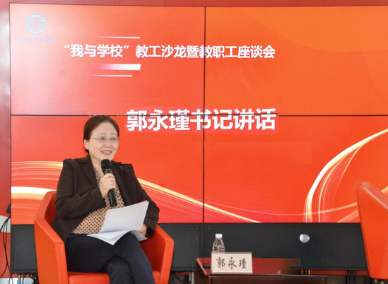 郭永瑾首先向新进校教职工简要介绍了学校的发展历史和近年在教学、科研、学生工作等方面取得的显著成绩。她指出,学校高质量通过本科教学工作合格评估是发展史上的重要里程碑,招生分数线连年攀升、就业率高居98.3%、教代表对学校领导班子的满意度屡创新高,得到了社会和各级领导的高度认可,这些成绩的取得是全校师生共同努力的结果,令人欣慰也给人鼓舞。未来学校的发展更需要大家的齐心协力,她对与会教师提出三点希望:一要争做高教综合改革的积极践行者。加快学习,树立终身学习理念,尽快熟悉新环境,适应新身份,主动融入学校改革发展中。二要爱岗敬业,树立良好的师德师风。关心关爱学生成长和发展。多向前辈讨教,尽快掌握教学方法,积极参与科研工作,不断提升教学科研能力,激发创新活力。三要胸怀全局,关心学校发展。以主人翁的姿态积极参与学校、学院的民主管理;开拓国际视野,培养开放眼光。她表示,学校将支持新教师的成长,工会和职能部门要及时收集新进教师的意见和建议,了解教师的所思所想,帮助大家解决身边急难愁盼之事。教师岗位,使命光荣、责任重大,希望大家在岗位上全面发挥自己的才能,以教书育人为己任,为学校的新一轮发展作出应有的贡献。
