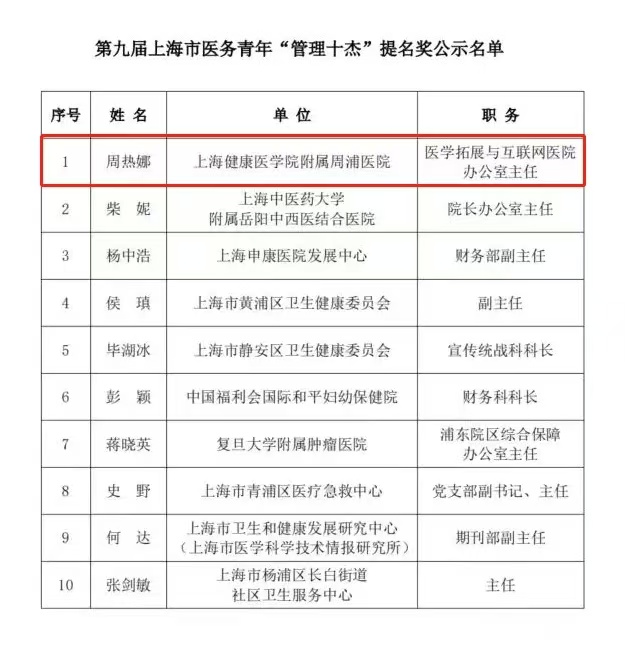 周热娜作为区域医疗中心的中层管理者,主动破局区域医联体建设,积极构建“大学参与、特色鲜明”的周康医联体数智化管理模式,推进浦东新区首个区域处方前置审核中心上线,为社区患者的用药提供切实保障。终评会上,周热娜作为20强中最年轻的选手,凭借其在医联体建设、数智化管理等方面的杰出贡献和卓越表现,经过激烈的自我展示和现场答题环节,从众多优秀候选人中脱颖而出,获得第九届上海市医务青年“管理十杰”提名奖。