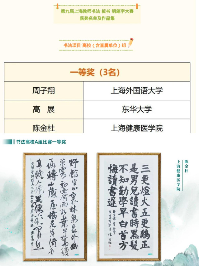 比赛现场,老师们全神贯注,一笔一画,一丝不苟,尽显扎实的书写功底。钢笔字笔画流畅,字体端庄;毛笔字龙飞凤舞,气势磅礴;粉笔字工整规范,布局合理。每一幅作品都凝聚着老师们对书法艺术的热爱和对教育事业的执着追求。在比赛过程中,老师们不仅展现了高超的书写技艺,更体现了他们严谨认真的态度,赛前精心准备,反复练习。最终我校陈金杜老师的书法作品荣获一等奖的好成绩。