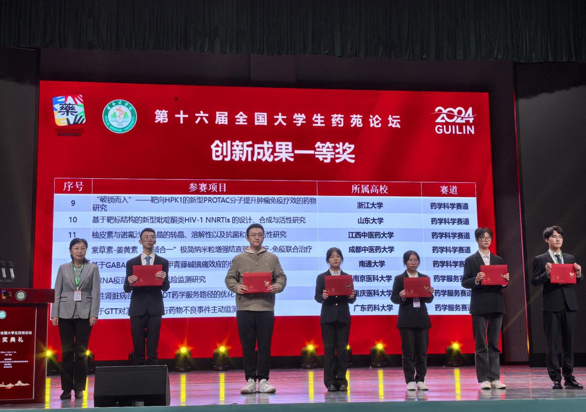 11月22日—24日,由全国药学类院校专业技术与实验技能竞赛组委会主办的第十六届全国大学生药苑论坛在桂林医学院举行。我校药学院学子首次荣获药学科学赛道创新成果一等奖,同时获得创新成果三等奖1项、优秀论文奖2项,创下我校参加此项赛事以来的最佳成绩!