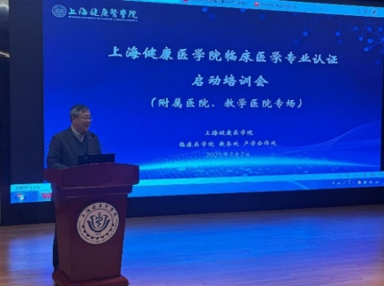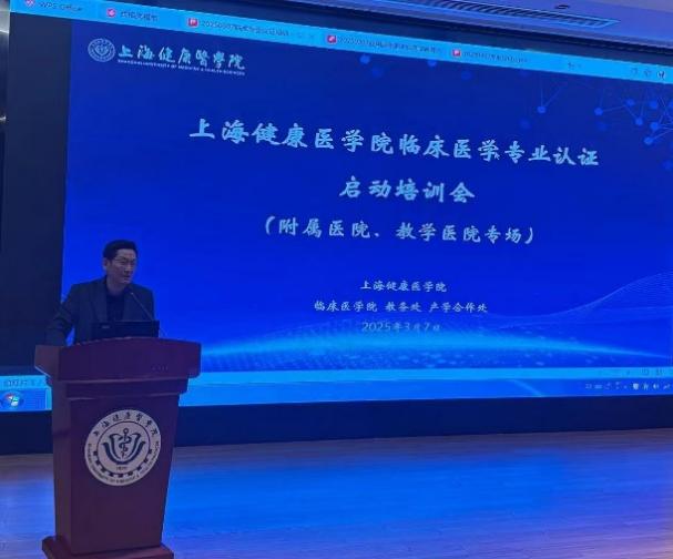 为贯彻落实国家医学教育创新发展要求,全面推进临床医学专业认证工作,2025年3月7日,上海健康医学院召开临床医学专业认证专题培训会暨附属(教学)医院启动会。副校长汤磊、教育部临床医学专业认证专家蔡巧玲教授、教务处处长王莉、第六人民医院临港院区、附属周浦医院、附属嘉定区中心医院、附属崇明医院、附属奉贤区中心医院、附属杨浦区精神卫生中心以及浦东新区公利医院等教学单位分管副院长、教学办主任、教研室主任及课程负责人、学生管理者等,临床医学院院领导及相关教师共计一百余人参会,会议由临床医学院院长曲毅主持。