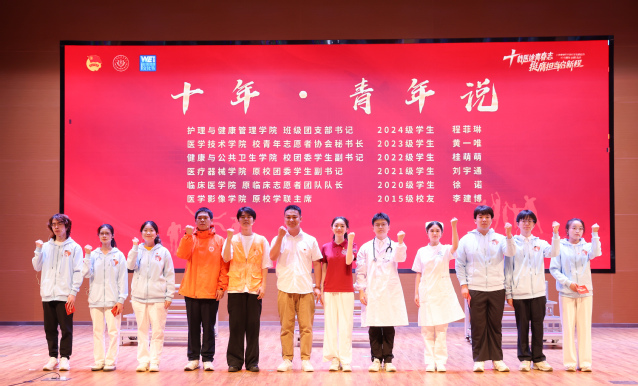 《十年・青年说》通过青年代表的奋斗故事,生动呈现了学校十年育人的生动事例。护理与健康管理学院班级团支书程菲琳励志用所学为西部群众守护健康,在西部热土上绽放青春光芒;来自医学技术学院的校青年志愿者协会秘书长黄一唯,通过进博会这堂行走的“大思政课”,沉浸式感受了高水平开放的时代脉搏,向全国、全世界展现了“健康青年”的青春风采;健康与公共卫生学院校团委学生副书记桂萌萌在“医路黔行”红医精神薪火传社会实践中用青年的本色宣讲,将个人理想融入国家发展大局。