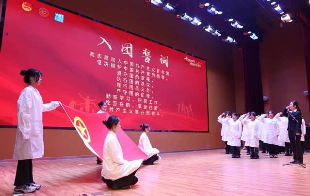 校团委挂职副书记李夏雯带领2024年度新发展团员代表进行入团宣誓。全体同学以最洪亮的声音,在鲜艳的团旗面前,举起右手,庄严宣誓。这铿锵有力的誓言激发了共青团员的光荣感与责任感,使团员青年深刻地认识到自己肩负的历史使命。