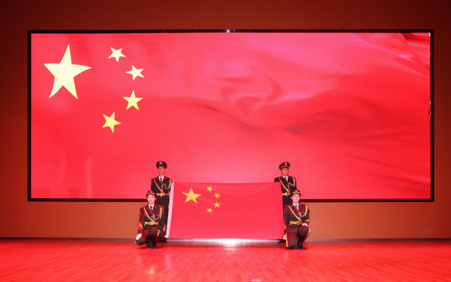 校国旗护卫队成员身着礼服,身姿坚挺、整齐划一,以铿锵步伐护送五星红旗进入会场。全场师生庄严肃立,高唱国歌。