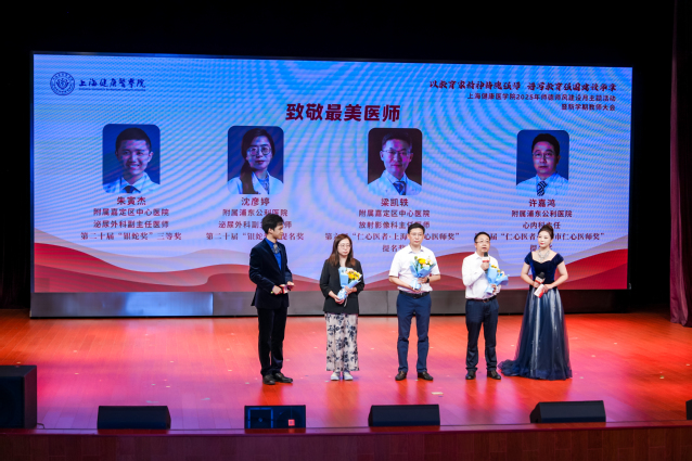 健康所系,性命相托。医师是健康中国建设的重要力量。他们既是医者,也是师者,传道授业解惑,护佑生命健康。今年医师节,我校附属医院四位医师喜获市级奖项。附属嘉定区中心医院朱寅杰、附属浦东公利医院沈彦婷分获第二十届“银蛇奖”三等奖和提名奖;附属嘉定区中心医院梁凯轶、附属浦东公利医院许嘉鸿分第六届“仁心医者·上海市仁心医师奖”提名奖。学生代表为到场的三位医师献花表达敬意。三位医生从学校综合改革为出发点,围绕自主培养应用型卓越医师、卓越技师、卓越工程师三类人才的主题分享了各自在医教协同育人方面的心得体会,叮嘱同学们要耐得住寂寞,保持终身学习的能力,勇于探索创新,为医学事业不懈奋斗。