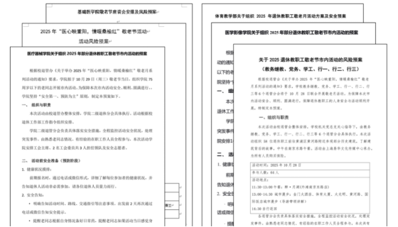 为保障本年度敬老月活动安全有序开展,校党委强化风险防控意识,构建“预防-保障-应急”全流程风险防控机制:针对性制定《敬老月活动风险预案》,细化健康筛查、交通保障、应急处置等环节——活动前建立特殊健康档案,精准掌握参与老同志身体状态;活动中配备随队医护人员与急救物资,设置临时医疗点;户外活动提前研判天气变化,制订备用路线预案。多部门联动的风险防控体系,为活动安全有序开展提供了坚实保障。