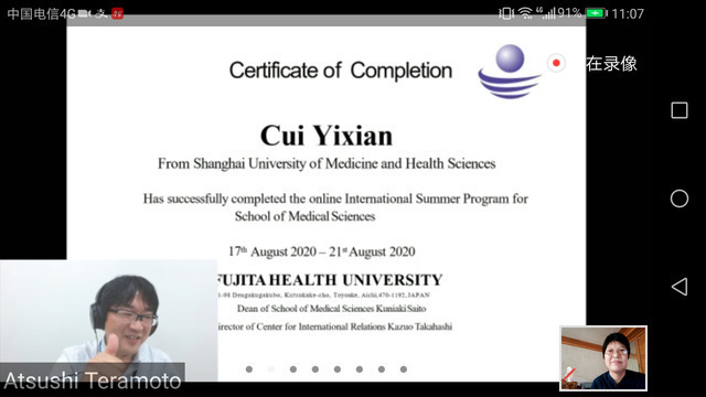 结营仪式上,双方师生依依惜别,期待下次再见。藤田医科大学给营员们颁发了修学证明。本次线上夏令营活动进一步增进了双方的了解,有效推动了双方在医学影像技术领域的国际交流与合作。